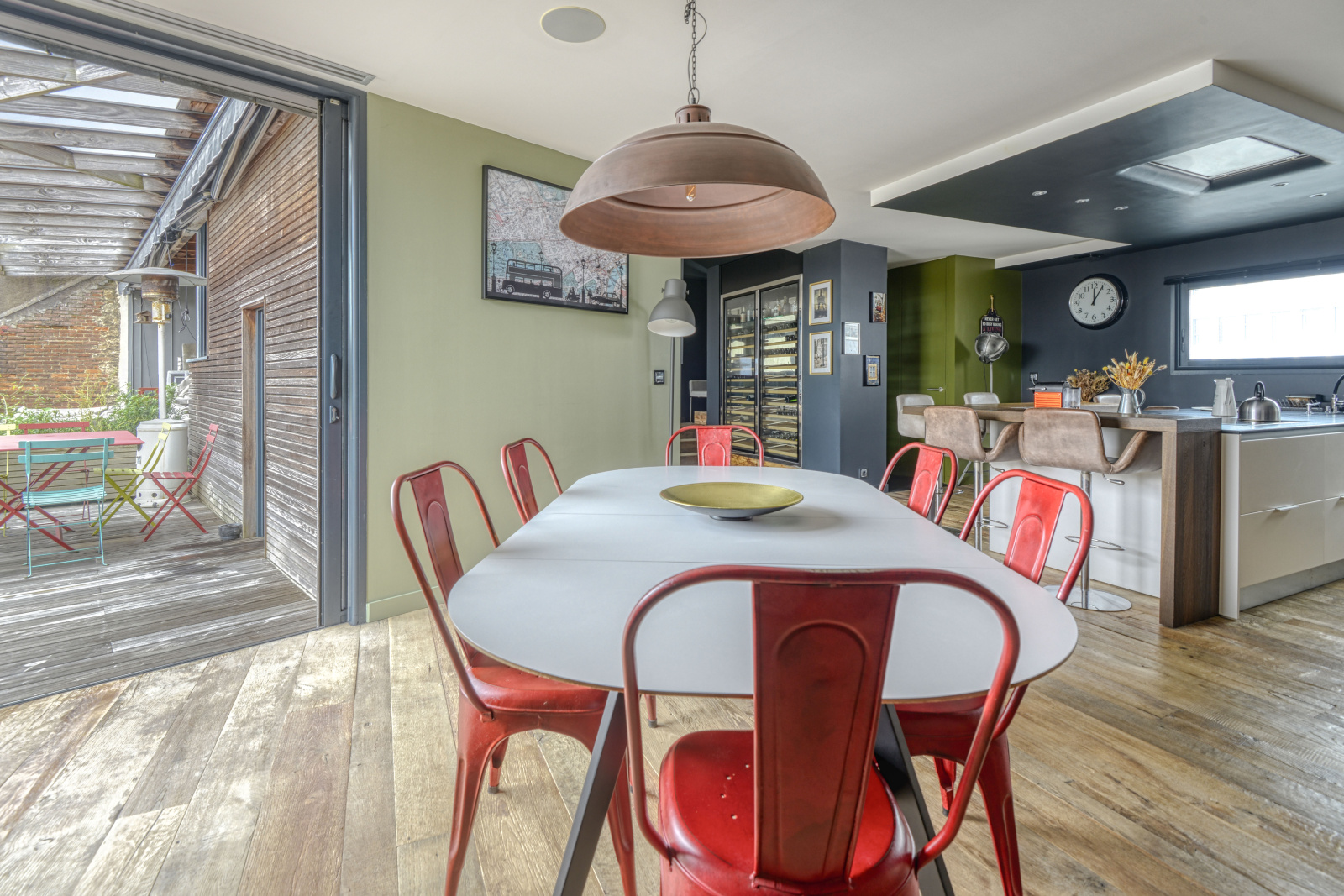 - un salon avec cheminée créant une atmosphère chaleureuse, une belle cuisine aménagée et équipée ouverte sur l'espace de vie, parfaite pour recevoir en toute convivialité, l'ensemble ouvrant sur une très grande terrasse de plus de 57 m², exposée plein sud, offrant un ensoleillement optimal